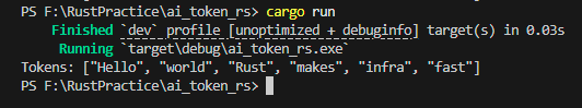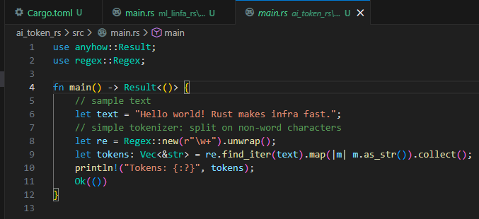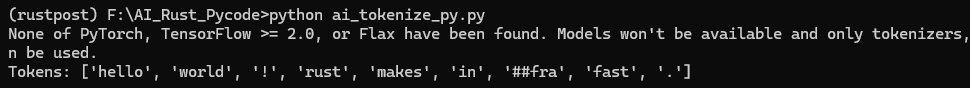 Rust’s regex-based tokenizer is extremely fast and lightweight — perfect for custom preprocessing stages or embedded NLP systems where learned tokenizers are unnecessary.
