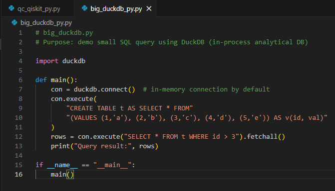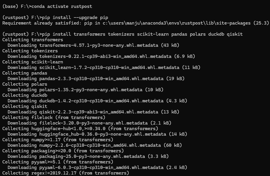 All Python code examples in this post were executed inside a Conda environment using the Anaconda Prompt, with the required libraries installed via pip — including transformers, tokenizers, scikit-learn, pandas, polars, duckdb, and qiskit. This ensures that all examples run consistently across systems.