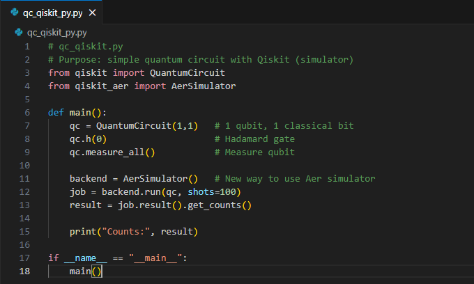 Imports Qiskit components: circuit builder, Aer simulator backend, and the execution helper. |