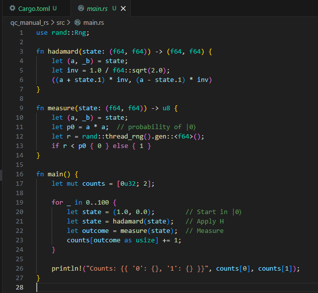 Rust doesn’t yet have a mature Qiskit-equivalent crate, but we can simulate qubits manually using amplitudes, Hadamard transforms, and measurement logic. This gives a clear view of how qubits evolve under quantum operations.