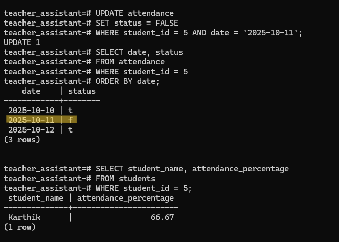 - The attendance percentage will not be calculated manually — a PostgreSQL Trigger will automatically update it whenever new attendance is recorded.