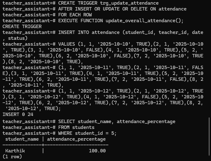 The trigger ensures that the attendance percentage calculation runs automatically whenever attendance changes.