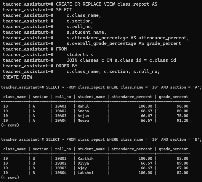 Instead of running multiple queries, create a database view that brings together each class’s students, their attendance percentage, and overall grade — all in one place.