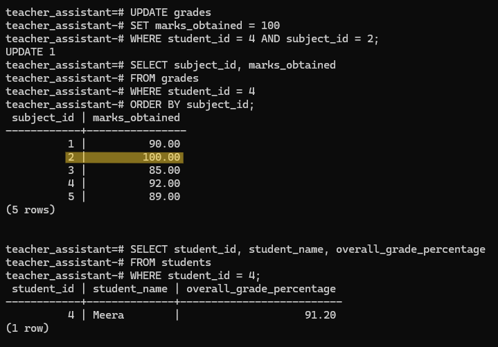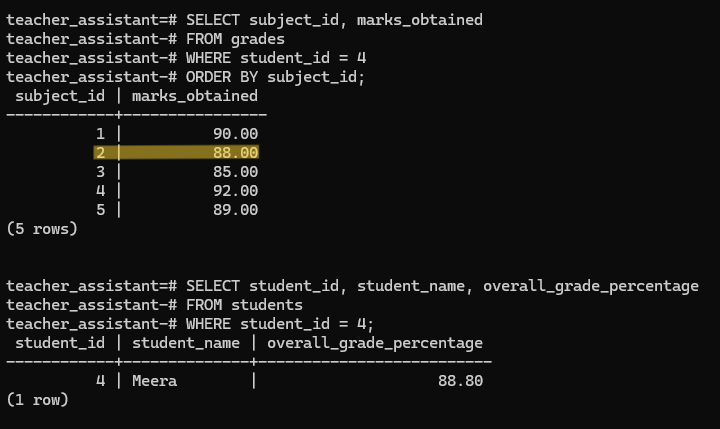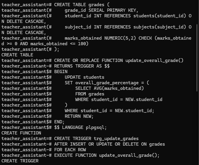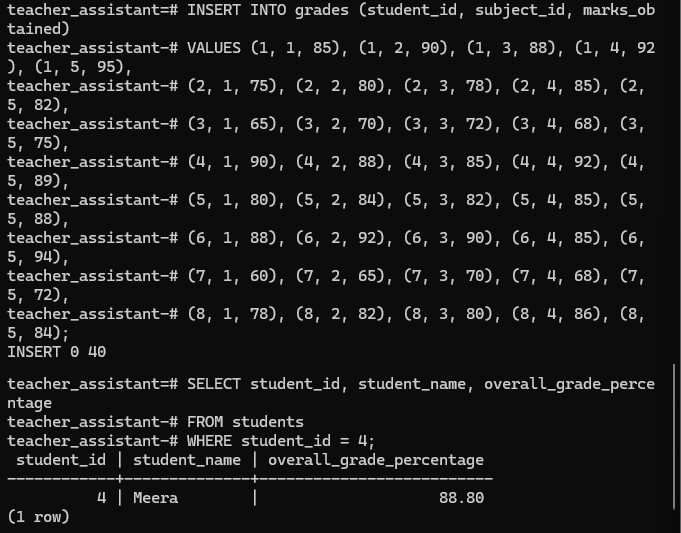 ON CONFLICT (student_id)clause in the trigger function relies on this constraint to decide whether to insert or update a record. - It ensures that instead of inserting duplicate rows, PostgreSQL will update the existing report for that student.