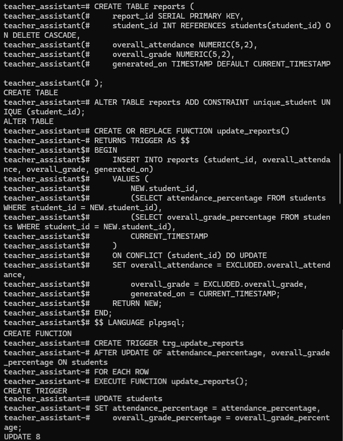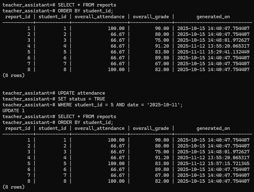 Whenever a student’s attendance or overall grade changes, we want the Reports table to refresh automatically — without manual triggers or recalculation. This is achieved through the update_reports() function and its trigger.
