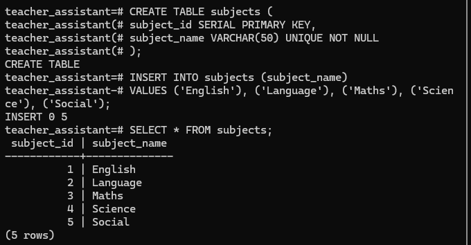 subject_name VARCHAR(50) UNIQUE NOT NULL
